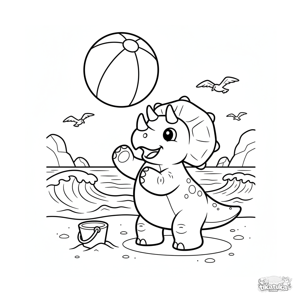 Lustiges Ausmalbild für Kinder 4-6: Ein freundlicher Triceratops spielt mit einem großen Strandball auf dem Sand eines urzeitlichen Ozeans.