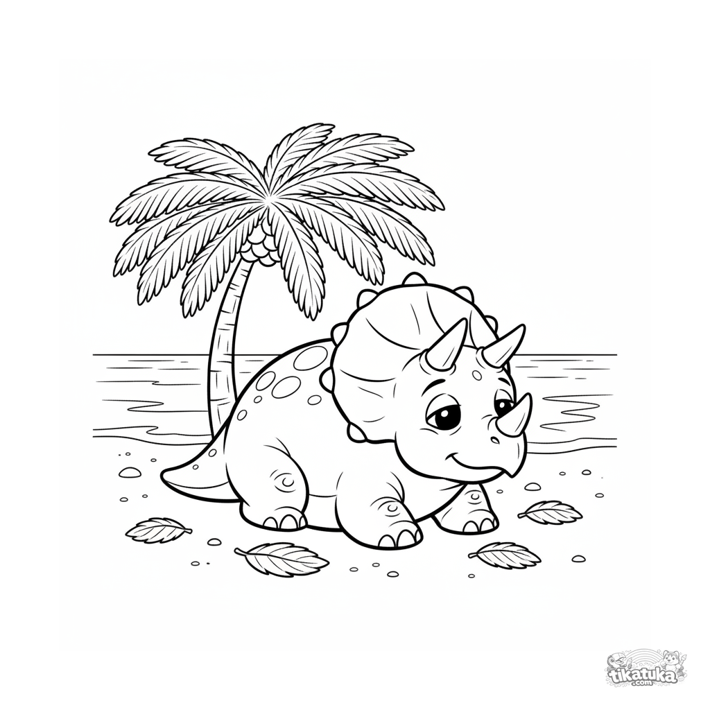 Ausmalbild für Kinder von 4-6 Jahren: ein großer Triceratops ruht im Schatten einer palmenähnlichen Pflanze am Sandstrand eines uralten Ozeans. Eine ruhige und friedliche Szene.