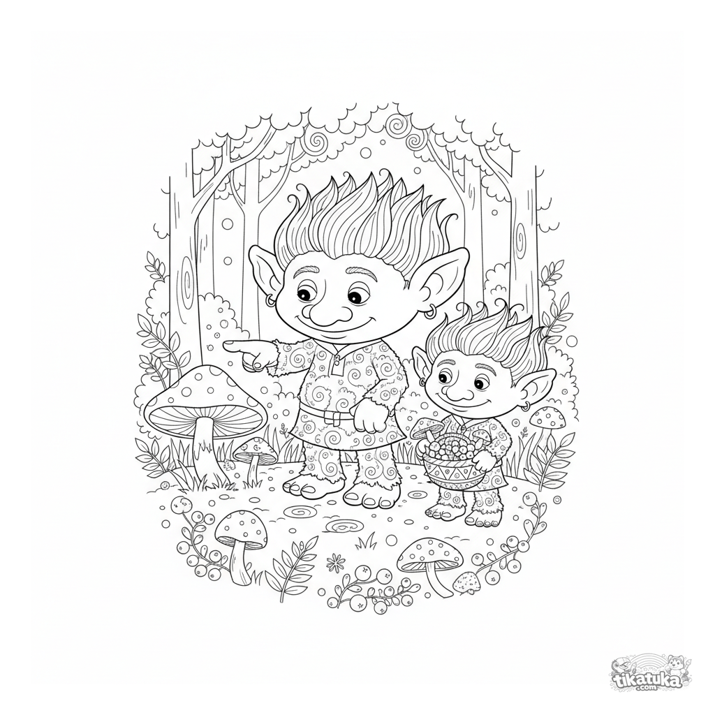 Ausmalbild für ältere Kinder: eine Familie freundlicher Trolle sammelt Pilze und Beeren in einem nordischen Wald. Detaillierte Szene aus der skandinavischen Folklore.