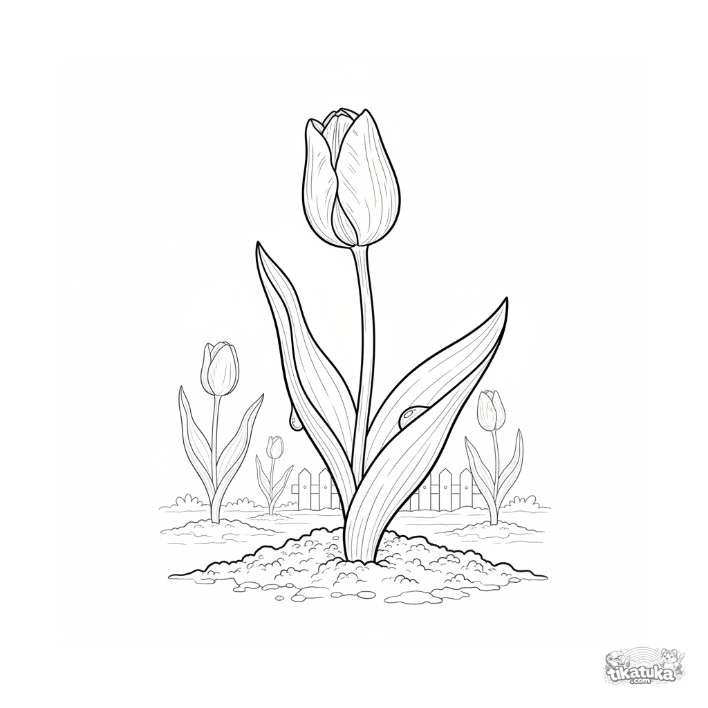 Ausmalbild einer Tulpenknospe für Kinder von 7-9. Elegante Blume mit Tautropfen im Gartenboden. Klare Umrisse, breite Ränder.