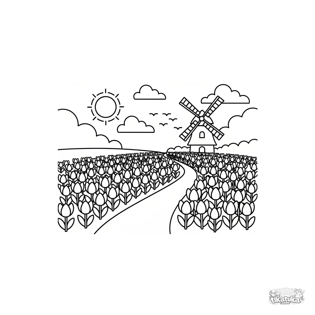 Ausmalbild für Kinder 7-9: Ein farbenfrohes Tulpenfeld mit einer Windmühle am Horizont. Weitläufige Szene im Paper-Cut-Stil.