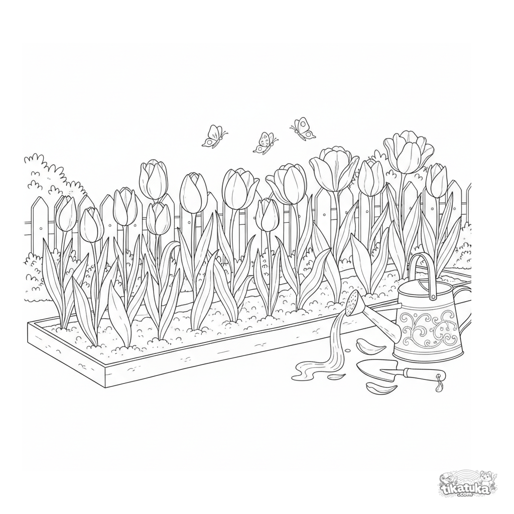 Detailliertes Ausmalbild für Kinder 10-12: Ein ordentliches Tulpenbeet mit einer Gießkanne und Werkzeugen. Realistische Texturen, Gartenszene.