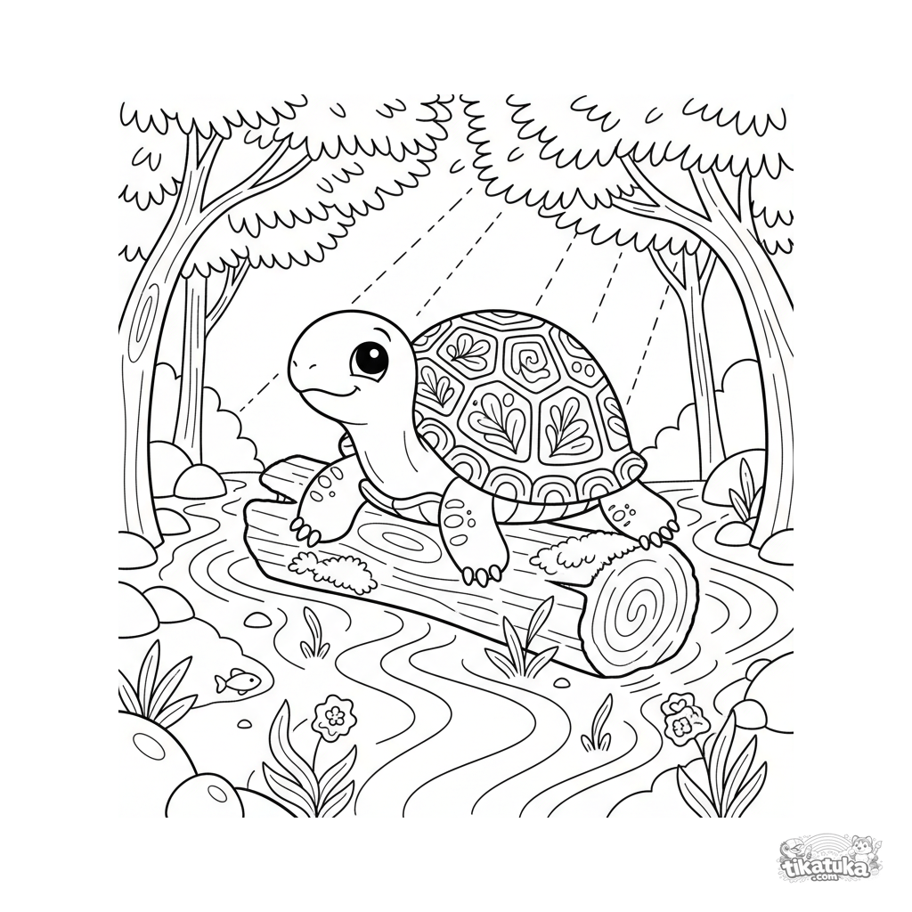 Ausmalbild für Kinder 4-6 im Volksdruck-Stil: Eine kleine Schildkröte liegt bequem auf einem versunkenen Baumstamm in einem Bach und sonnt sich. Dekorative Formen.