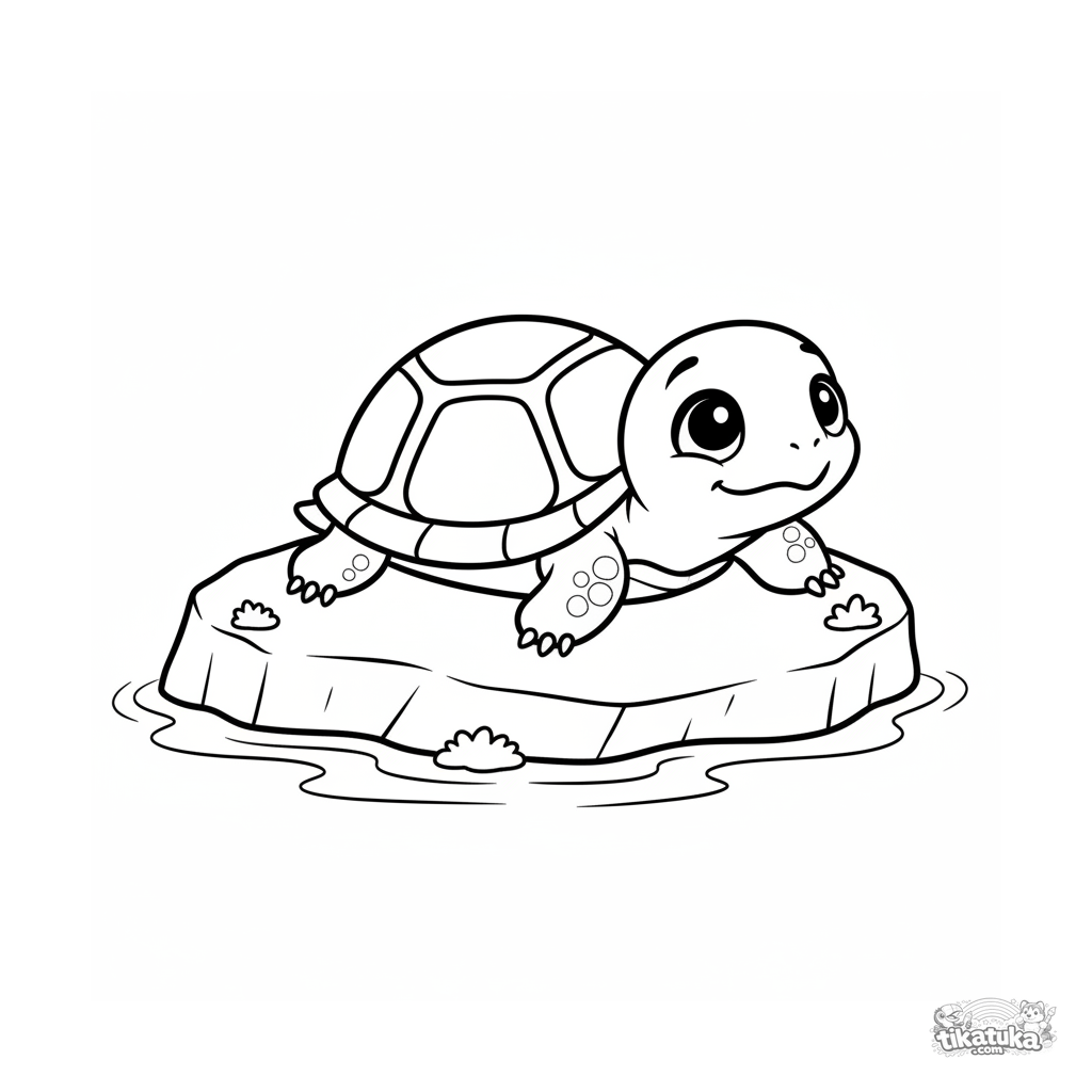 Sehr einfaches Ausmalbild für Kleinkinder 2-3: eine Schildkröte sonnt sich auf einem Stein an einem Bach. Große, einfache Formen.