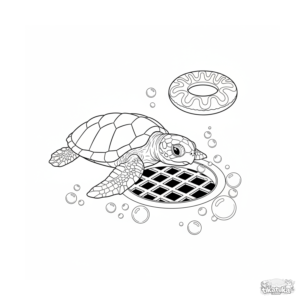Detailliertes Ausmalbild für Kinder 10-12: Eine Babyschildkröte mit gemustertem Panzer untersucht einen Poolablauf, darüber schwebt ein Schwimmring. Realistische Linien und Texturen.
