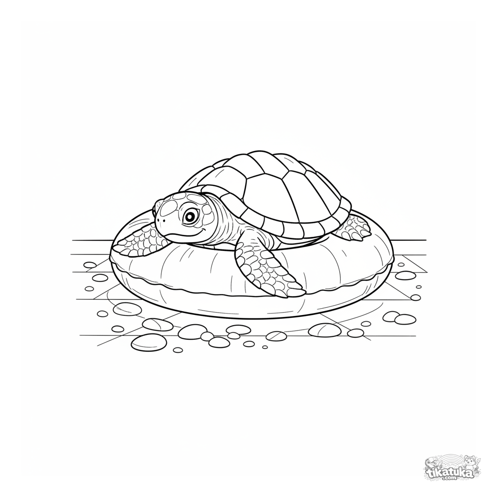 Detailliertes Ausmalbild für Kinder 10-12: Eine Babyschildkröte mit gemustertem Panzer ruht auf der inneren Kante eines Schwimmrings auf dem Beckenboden.