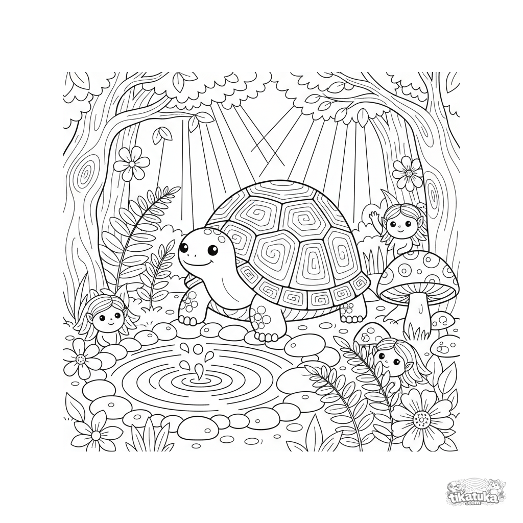 Ausmalbild für Kinder 3-6: Eine weise Schildkröte bewacht eine magische Quelle in einem uralten Wald. Große, einfache Formen und ein freundlicher Charakter.