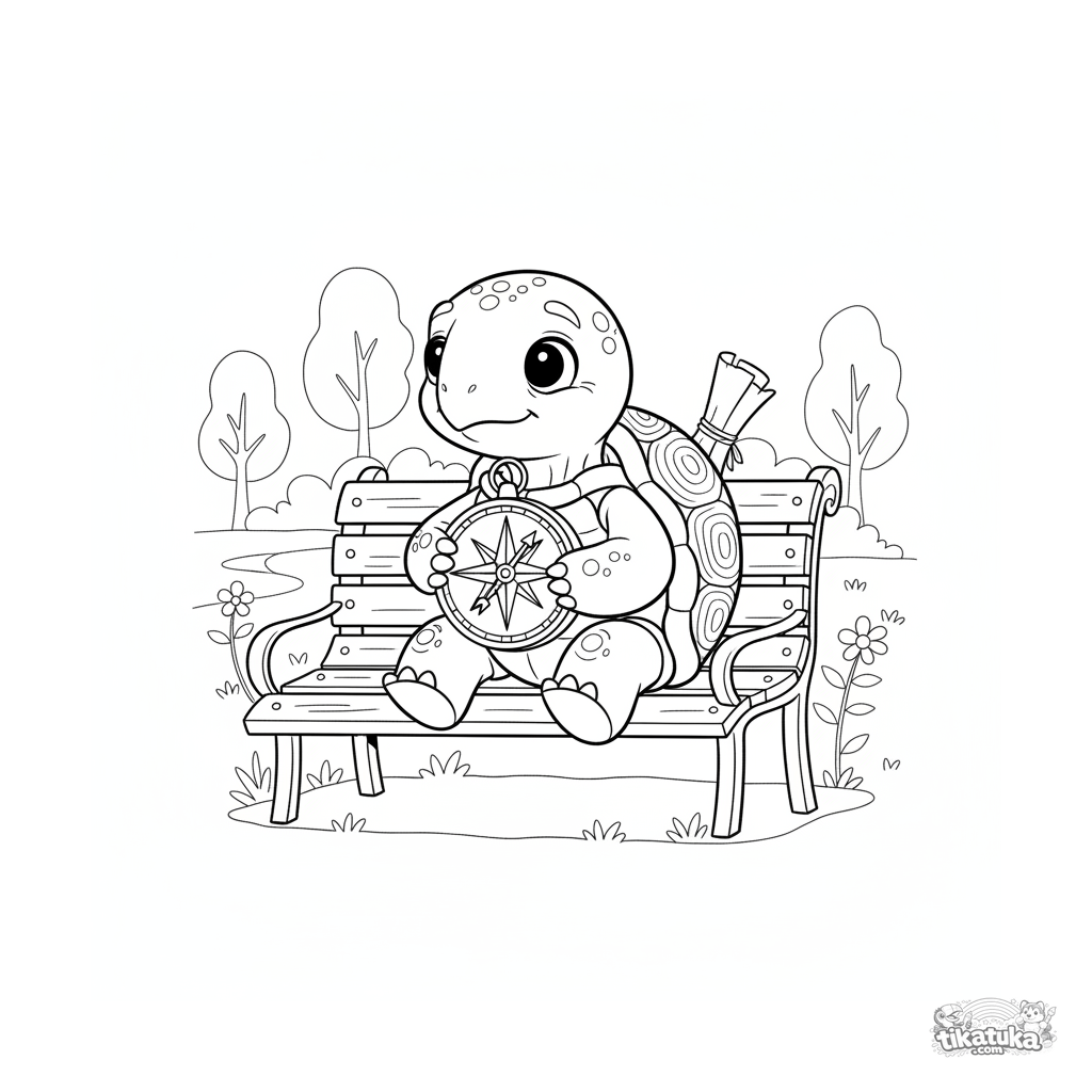 Ausmalbild für Kinder 7-9: Eine weise Schildkröte studiert einen Kompass auf einer Parkbank und bereitet sich auf eine Reise vor. Ausdrucksstarke Zeichnung im klassischen Stil.