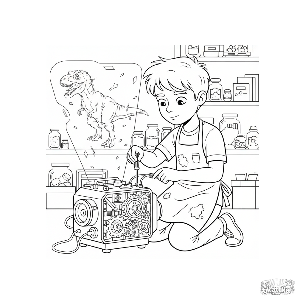Ausmalbild für Jugendliche 7-9: Ein Erfinderjunge repariert in einem geheimen Labor einen Hologramm-Projektor mit Dinosaurierbild. Detaillierte Werkzeuge und Komponenten.