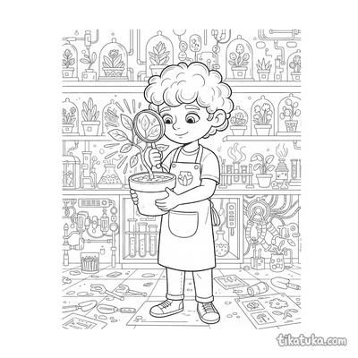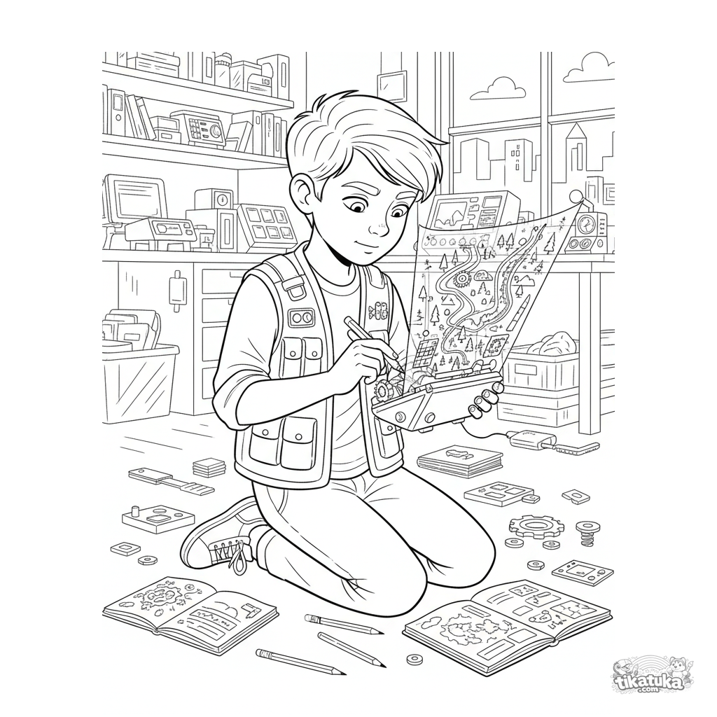 Ausmalbild für Jugendliche 7-9: ein junger Erfinder repariert einen holographischen Kartenprojektor in einem geheimen Labor.