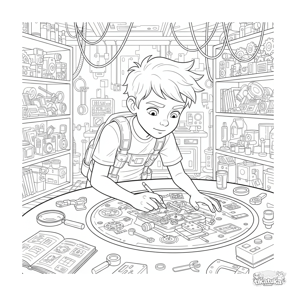 Detailliertes Ausmalbild für 10-12 Jahre: ein Jugendlicher arbeitet an einem holographischen Maschinenbauplan in einem geheimen Erfinderlabor.