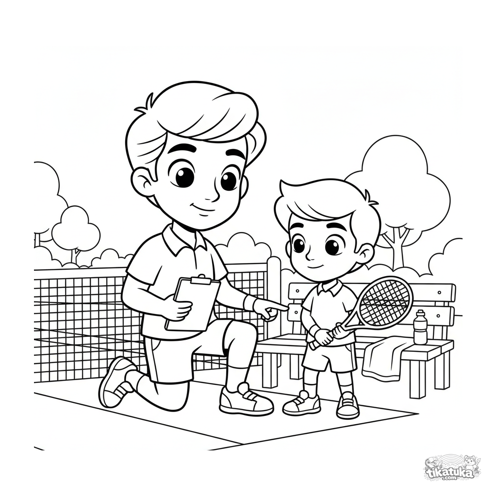 Ausmalbild für Kinder 7-9 Jahre: ein Tennistrainer erklärt einem jungen Spieler die Technik am Netz. Eine Szene über Lernen und Unterstützung.