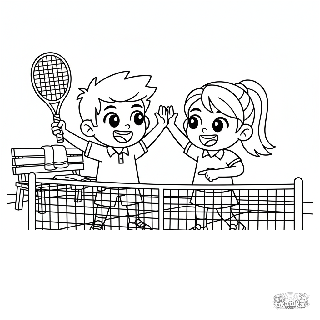 Ausmalbild für Kinder 7-9 Jahre: ein Doppel-Tennismatch, ein freudiger Moment der Siegesfeier. Dynamische Szene mit zwei Charakteren und Platzdetails.