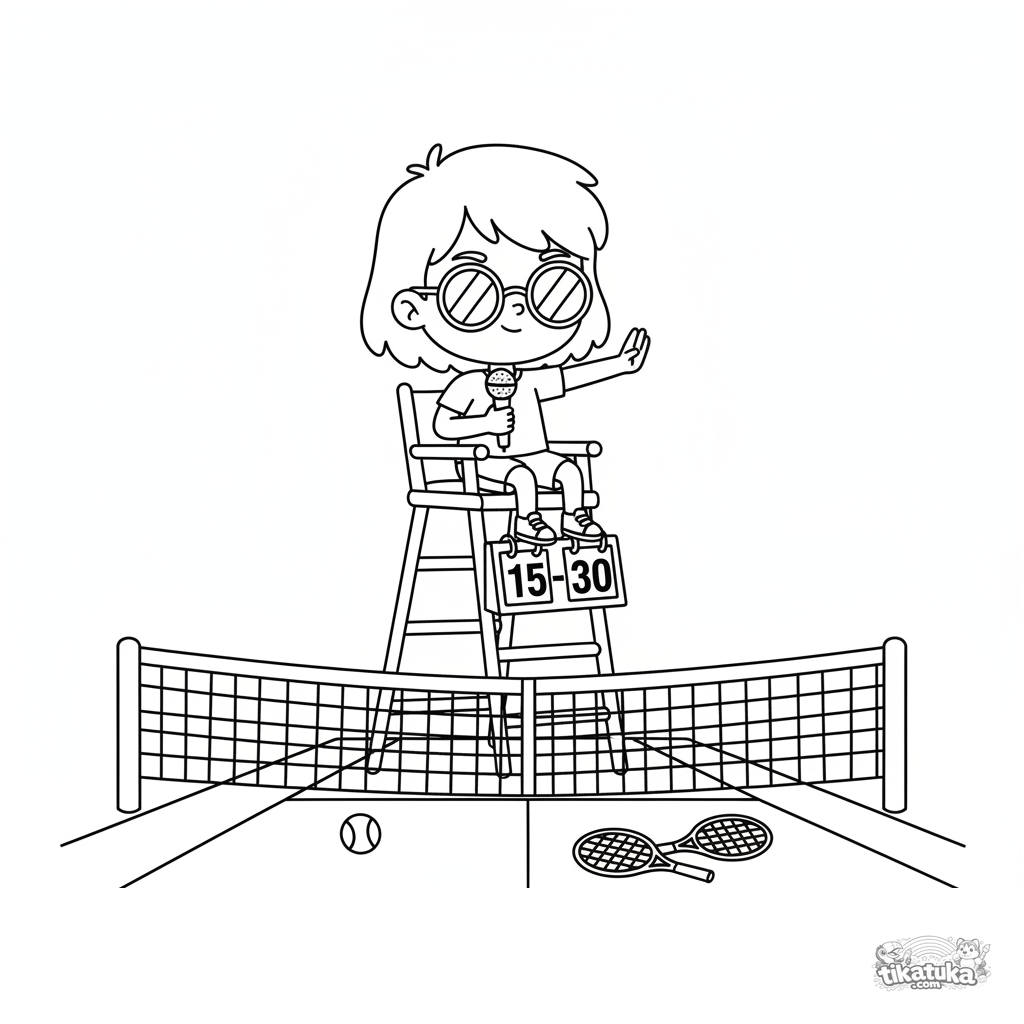 Ausmalbild für Kinder 7-9 Jahre: ein junger Schiedsrichter auf dem hohen Tennis-Schiedsrichterstuhl trifft eine Entscheidung. Szene mit Mikrofon, Anzeigetafel und Netz.