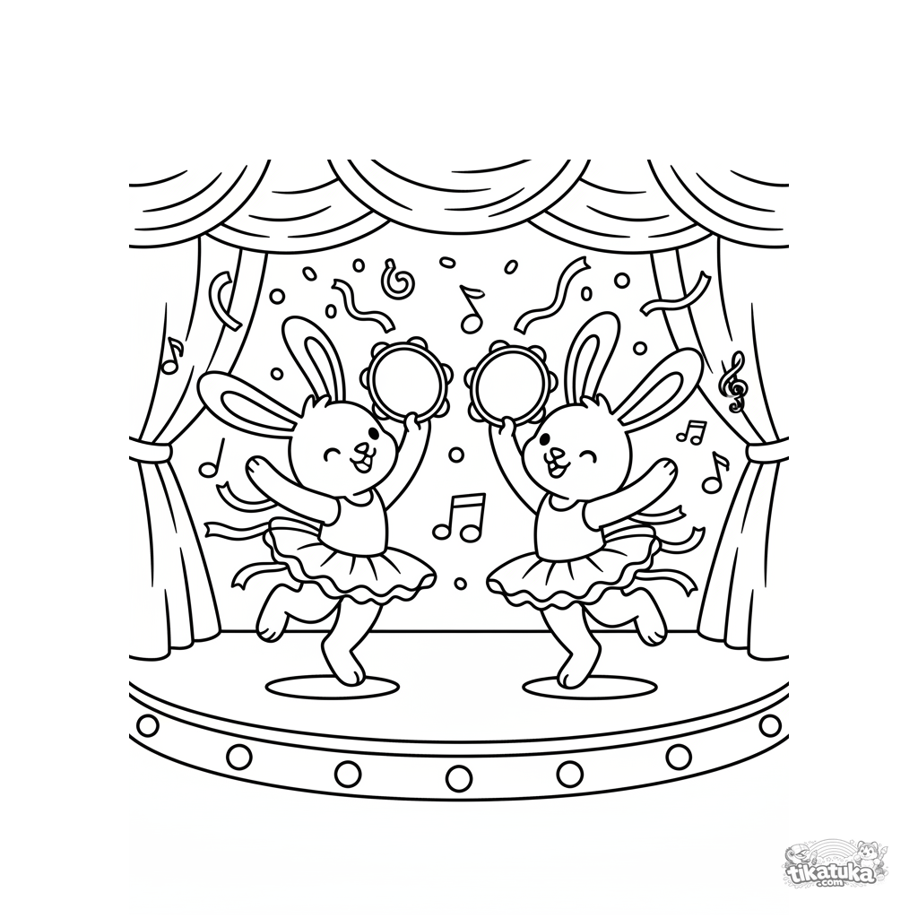 Ausmalbild für 7-9 Jahre: Zwei fröhliche Hasen-Zwillinge tanzen mit Tamburinen auf einer Konzertbühne. Weicher Puppenstil, dynamische Posen.