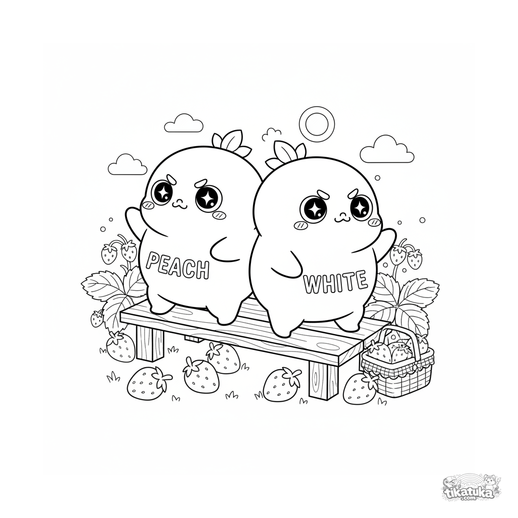 Ausmalbild für Kinder 4-6: zwei fröhliche Mochi balancieren auf einer Picknickbank zwischen Erdbeer-Mochi. Dynamische Szene mit freundlicher Stimmung.