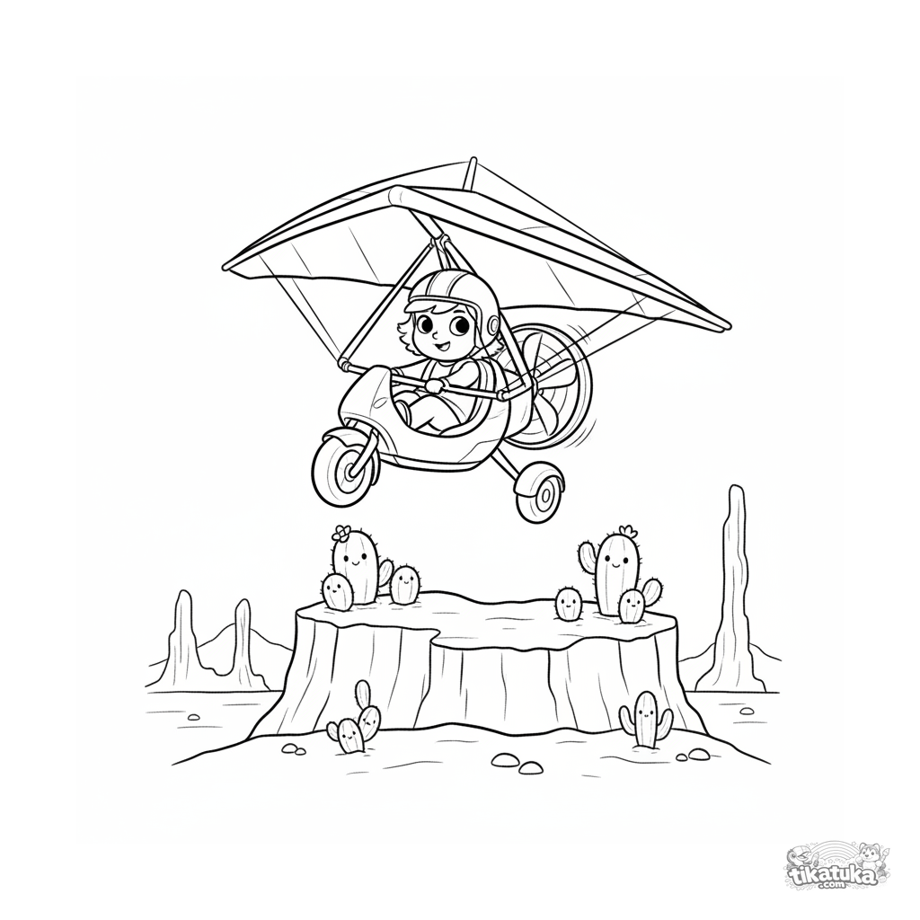 Ausmalbild für Kinder von 4 bis 6: Ein farbenfrohes Ultraleicht-Trike mit einem Lüfterpropeller fliegt fröhlich über einem Wüsten-Tableau, das mit Kakteen übersät ist, sein behelmter Pilot lehnt sich in die Kurve.
