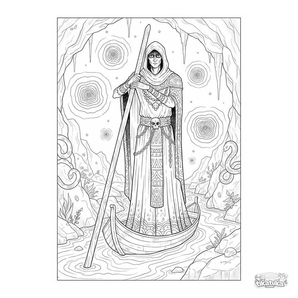 Komplexes Ausmalbild für Kinder 10-12: der geheimnisvolle Fährmann Charon auf einem unterirdischen Fluss, der durch Medusas Höhle fließt. Atmosphärische Szene im Aquarell-Skizzen-Stil.