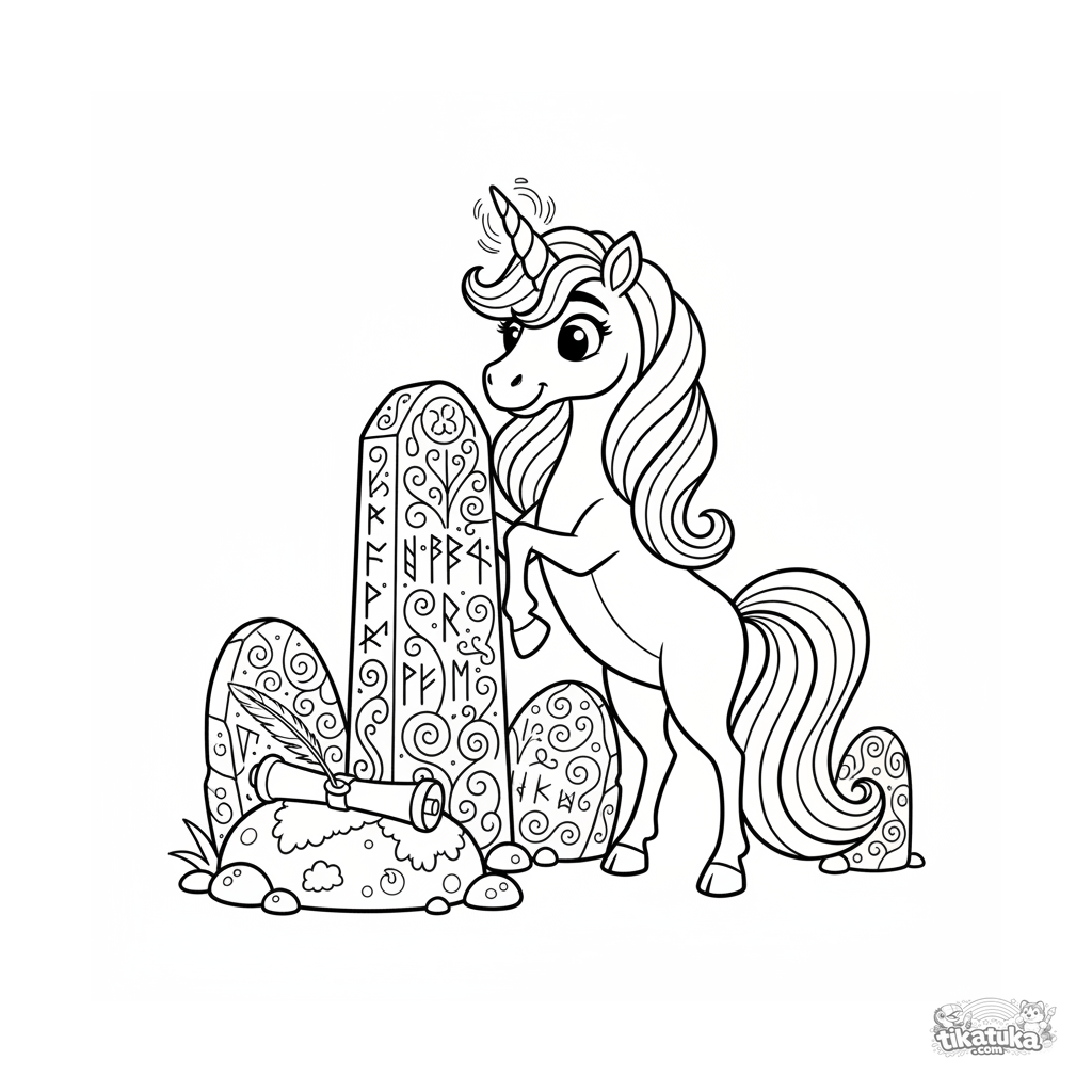 Ausmalbild für 7-9 Jahre: ein graziles Einhorn studiert alte Runen auf einem Monolithen. Szene mit Details für kreatives Ausmalen.