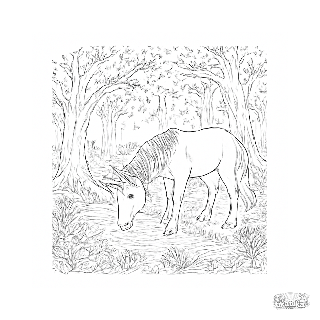 Ausmalbild für Kinder. Lavendel-Einhorn trinkt aus leuchtendem Teich, Glühwürmchen um Horn, mystische Blumen und alte Bäume. Kostenlos herunterladen.