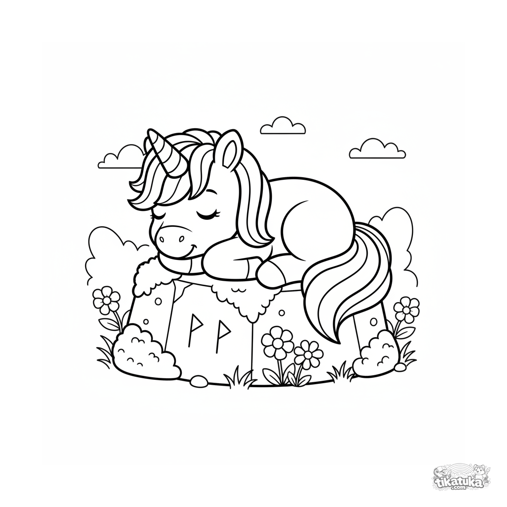 Ausmalbild für Kinder 4-6: ein kleines Einhornfohlen schläft fest auf einem moosigen uralten Runenstein. Friedliche Szene mit Blumen.