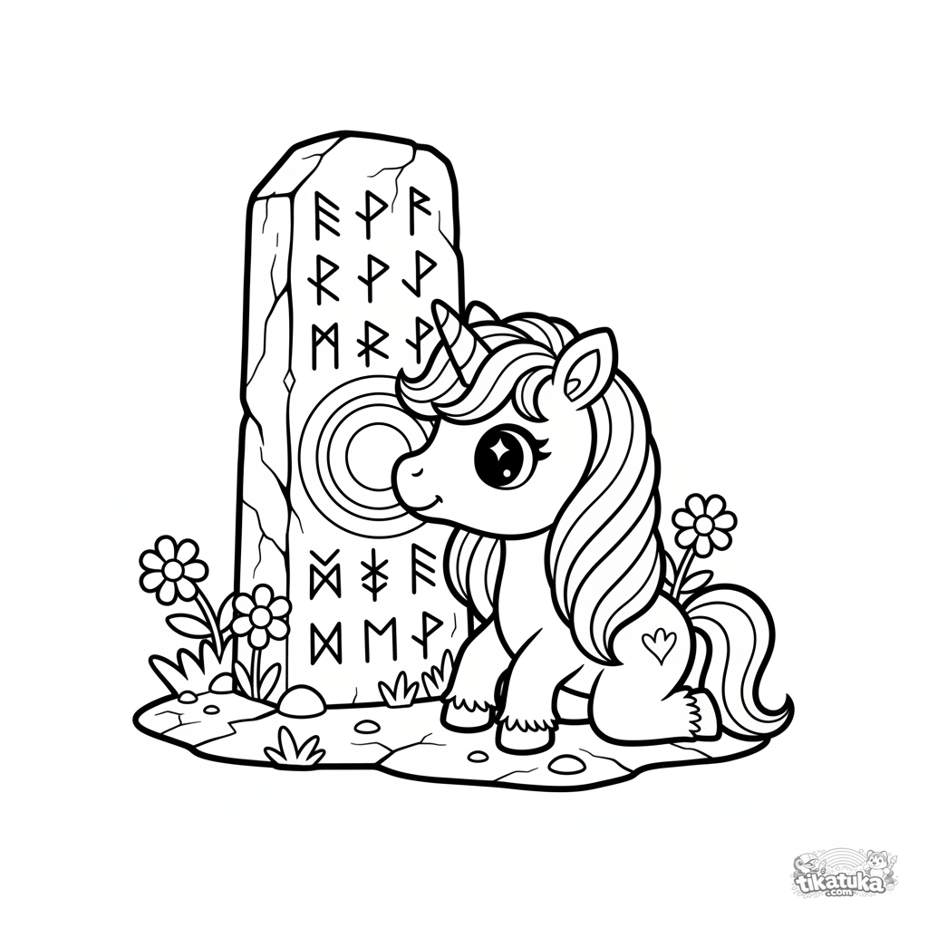 Ausmalbild für Kleinkinder: Ein winziges Einhornfohlen bestaunt eine leuchtende Rune am Fuß eines Monolithen. Riesige einfache Formen, breite Ränder.