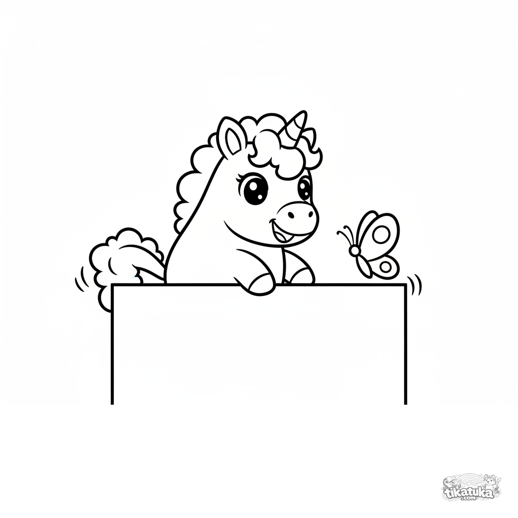 Einfaches Ausmalbild für Kleinkinder 2-3: Ein pummeliges Einhorn-Fohlen im Plüschmaskottchen-Stil spielt Verstecken hinter einem großen Runenstein. Große, freundliche Formen.