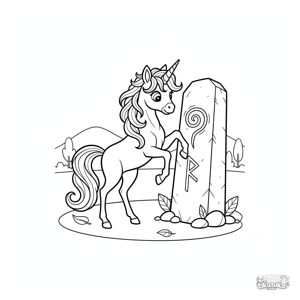 Ausmalbild für Kinder von 4-6 Jahren: ein junges Einhornfohlen studiert alte Runen auf einem Monolithen. Ausgewogenes Detail, klare Formen, eine magische Szene zum Ausmalen.