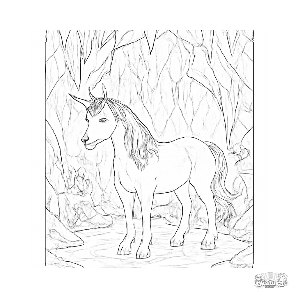 Ausmalbild für Kinder. Silbernes Einhorn in glitzernder Eiskristallhöhle mit leuchtenden Pilzen und gefrorenem Teich. Kostenlos herunterladen.
