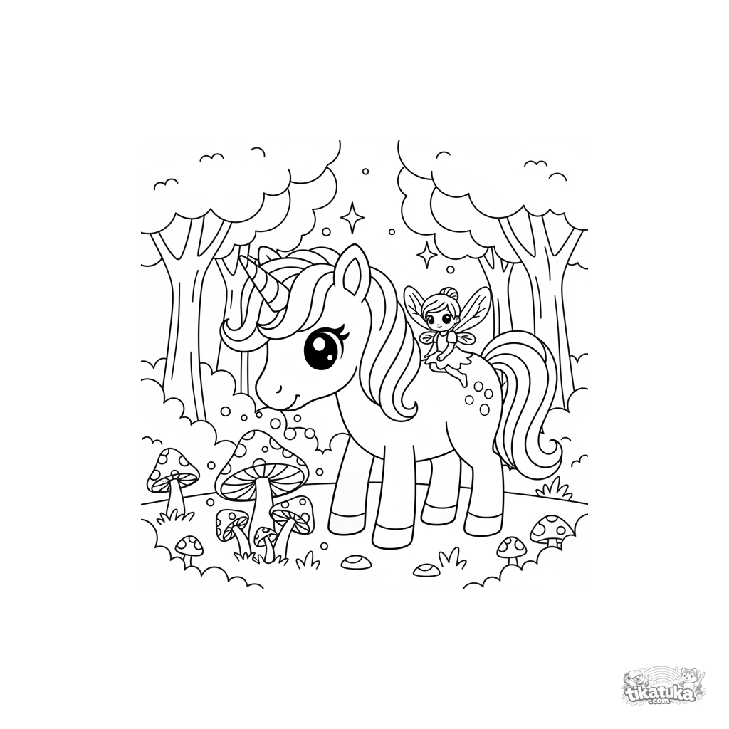 Ausmalbild für Mädchen: Ein süßes Einhorn weidet auf leuchtenden Pilzen in einer Zauberlichtung. Für Kinder von 4-6 Jahren. Glitzer in der Luft, eine Fee auf seinem Rücken.