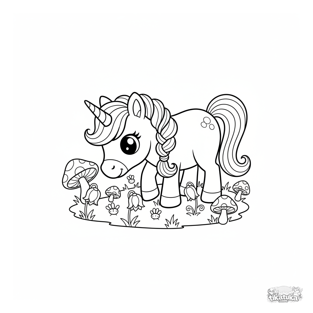 Ausmalbild für Mädchen 4-6: Ein grazielles Einhorn-Pony mit geflochtener Mähne grast auf einer Zauberwiese mit leuchtenden Pilzen und Glockenblumen. Märchenhafte Szene.