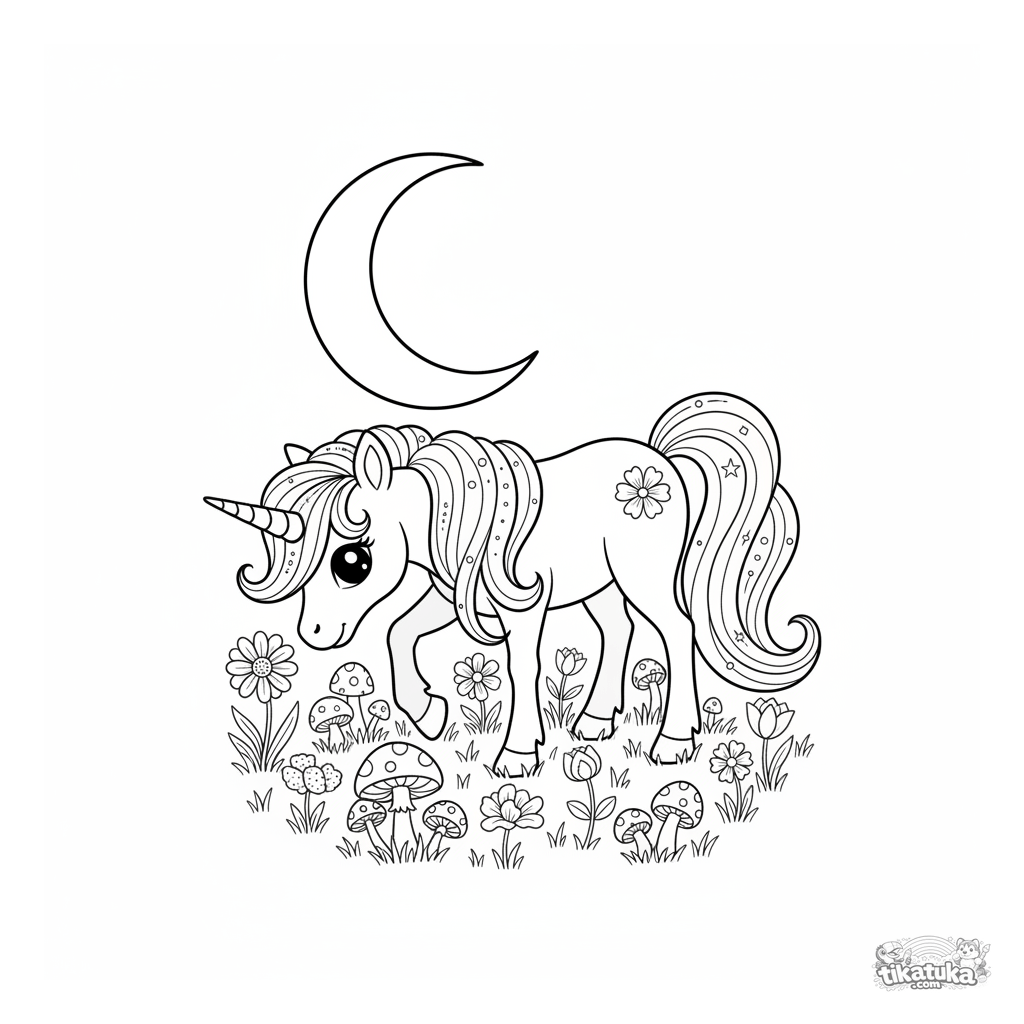 Schwieriges Ausmalbild eines magischen Einhorn-Ponys auf einer mondbeschienenen Wiese. Für Kinder von 8-12 Jahren. Detaillierte Szene mit Nachtblumen und leuchtenden Pilzen.