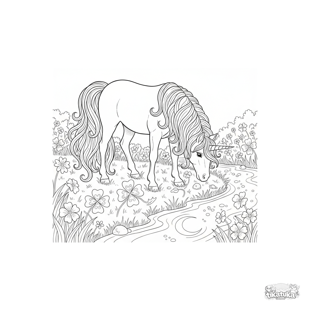 Detailliertes Ausmalbild eines anmutigen Einhorns auf einer mondbeschienenen Wiese. Für Kinder ab 8 Jahren. Realistischer Stil.