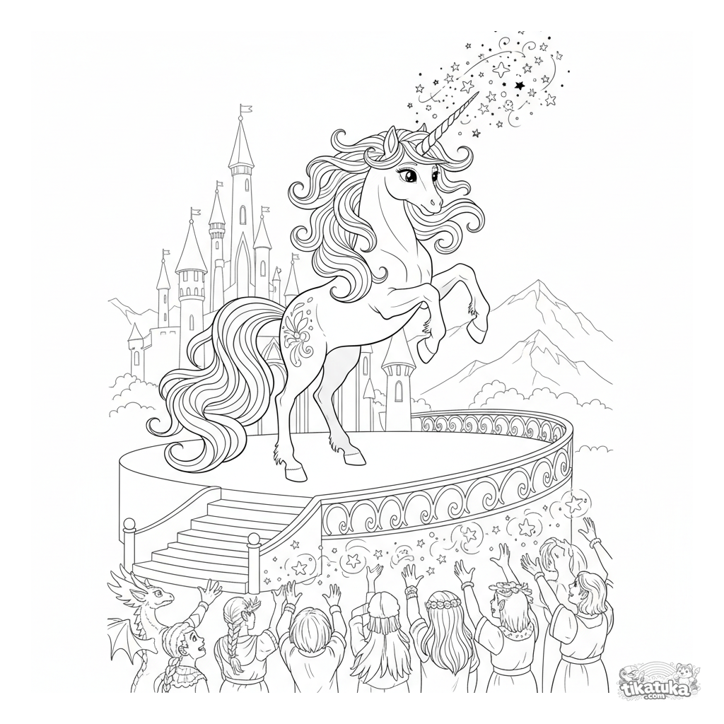 Detailliertes Ausmalbild für Kinder 10-12: Ein Einhorn führt eine magische Lichtshow auf der Bühne auf. Anspruchsvolle Linienführung.