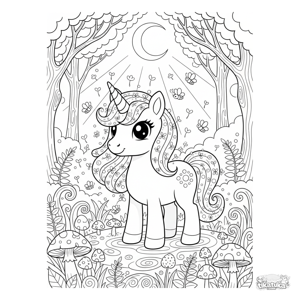 Schwieriges Ausmalbild für Mädchen von 7-12 Jahren. Ein magisches Einhornpony mit leuchtender Löwenzahnsamen-Mähne in einer mondbeschienenen Waldlichtung.