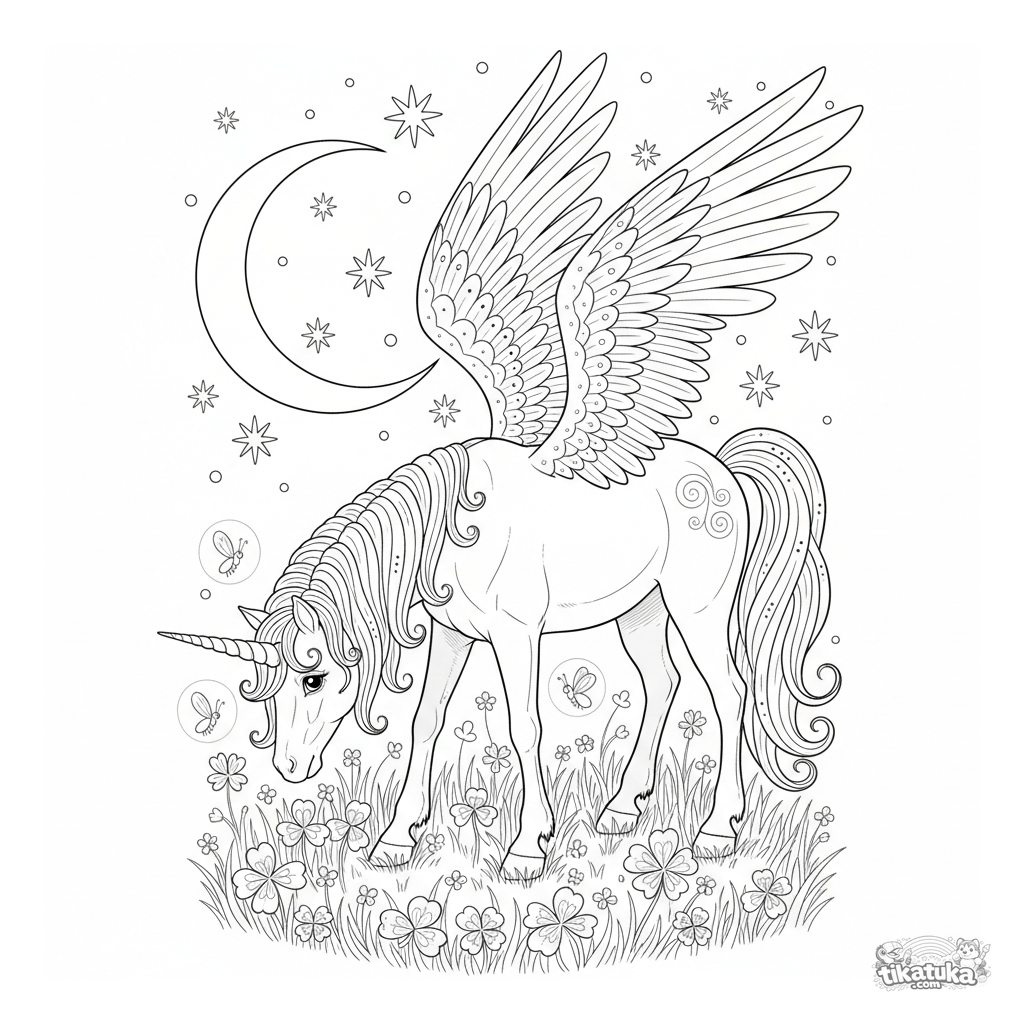 Schwieriges Ausmalbild eines realistischen Einhorn-Ponys mit gefiederten Flügeln, das im Mondschein auf einer Wiese grast. Für Kinder von 8-12 Jahren.