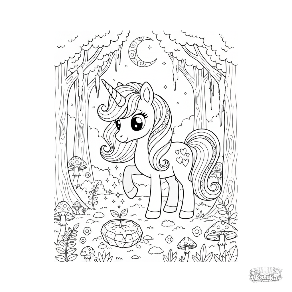 Schwieriges magisches Ausmalbild für Mädchen von 8-12 Jahren. Ein Einhorn-Pony mit Kristallhorn bewacht einen magischen Keimling in einem mondbeschienenen Hain.