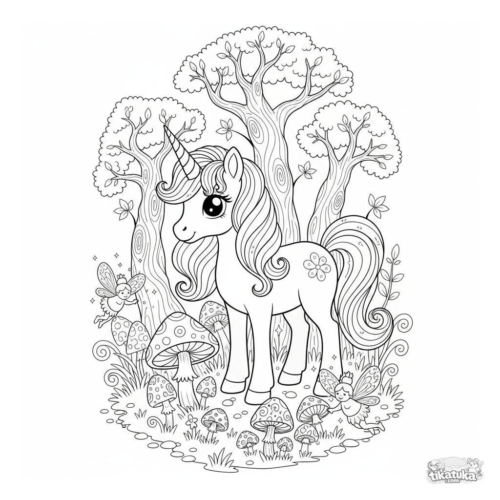 Ausmalbild eines anmutigen Einhorn-Ponys, das zwischen leuchtenden Pilzen in einem verzauberten Wald weidet. Für Kinder von 5 bis 8 Jahren.