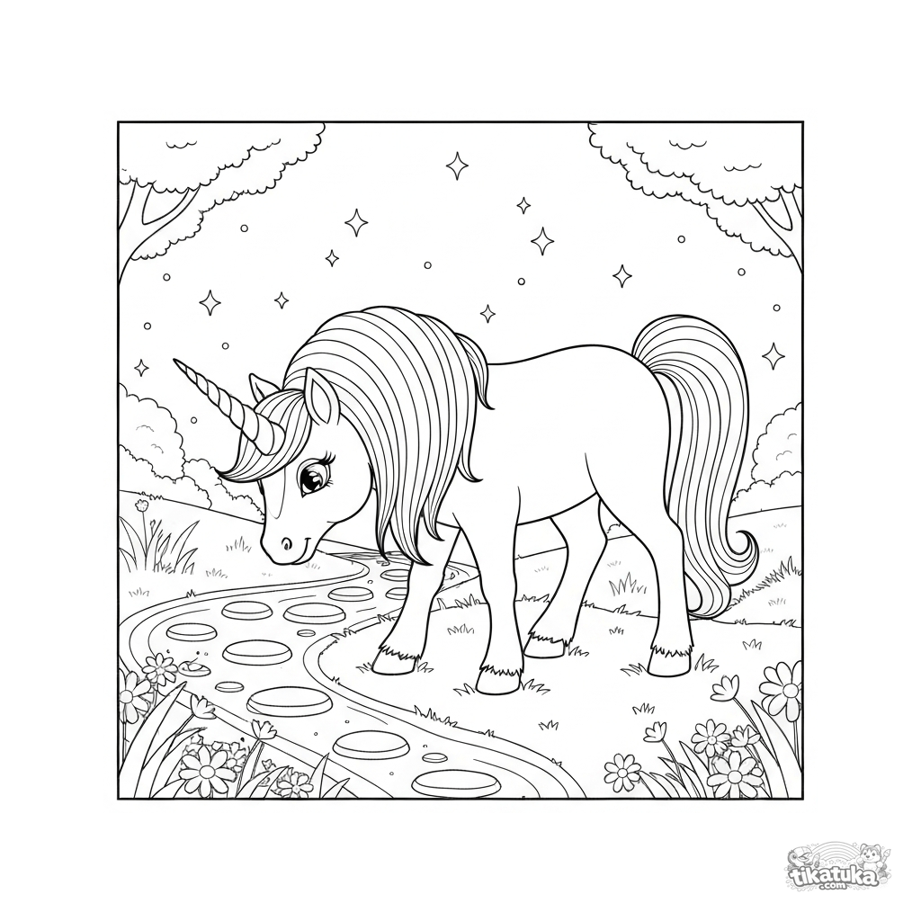 Ausmalbild eines süßen Einhorn-Ponys, das auf einer Zauberwiese mit leuchtenden Blumen grast. Für Kinder von 3-6 Jahren. Funkelnde Sterne schweben umher, mit einem Bach im Hintergrund.