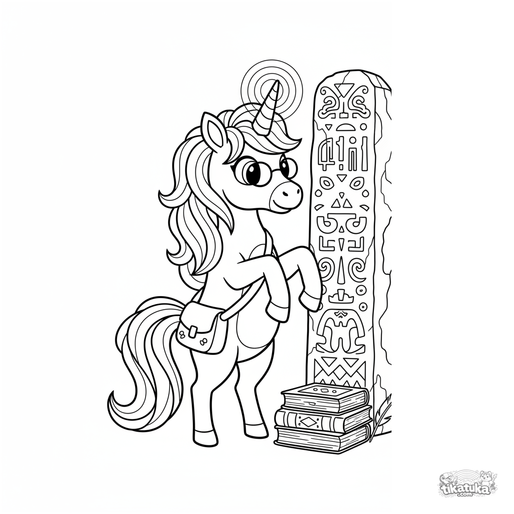 Detailliertes Ausmalbild für Kinder 10-12 Jahre: ein bebrilltes Einhorn studiert aufmerksam alte Glyphen auf einem Monolithen. Viele Elemente: Bücher, Umhängetasche, komplizierte Steinmuster.