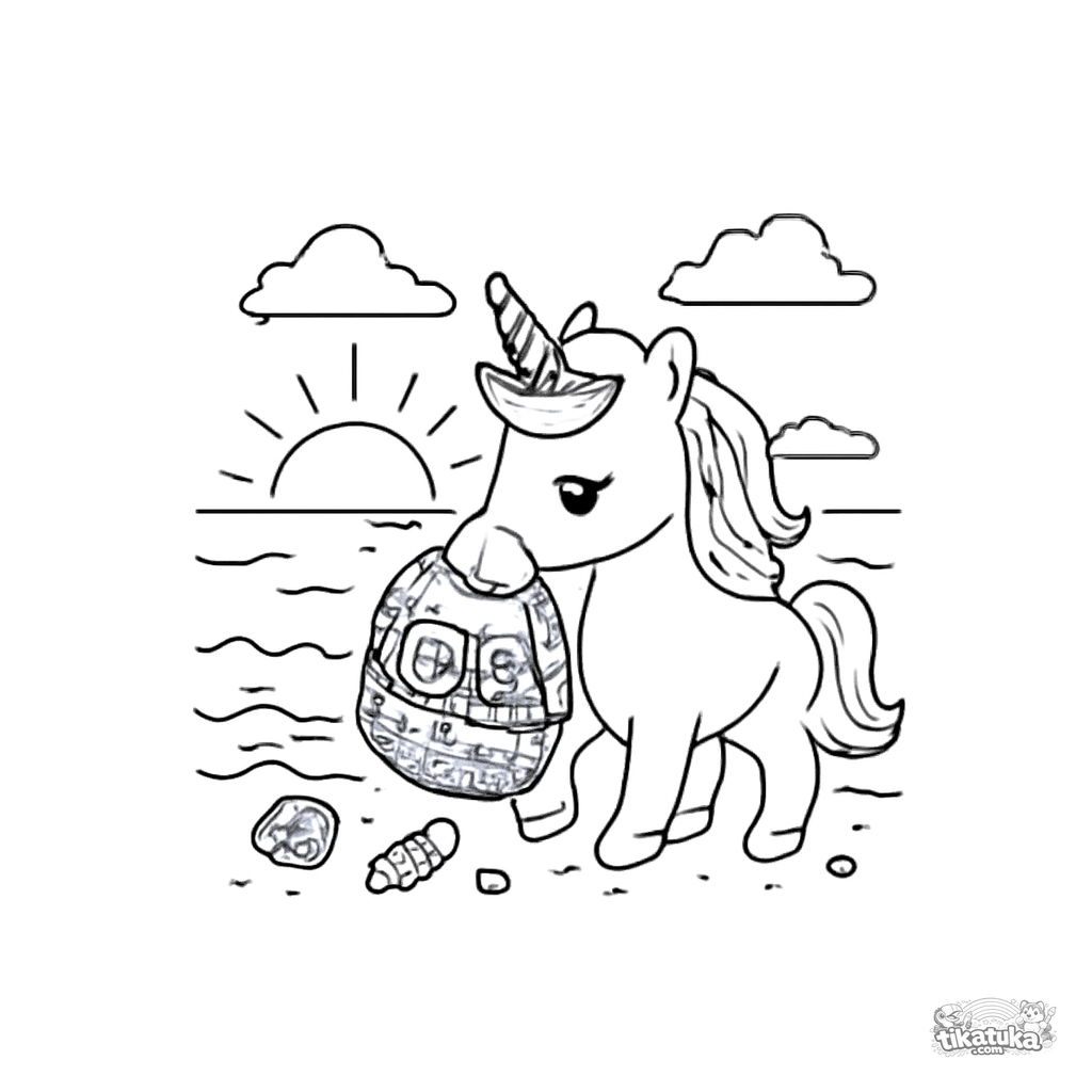 Ausmalbild für Kinder. Pastellrosa Einhorn mit perlengeschmücktem Horn sammelt bunte Muscheln in einem Korb am Sandstrand bei Sonnenaufgang. Kostenlos herunterladen.