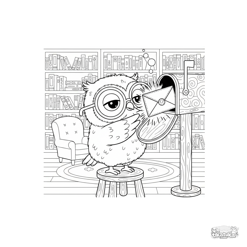 Eule Oof zieht in einer Bibliothek einen leuchtenden Umschlag aus einem Briefkasten. Jetzt herunterladen, ausdrucken oder online ausmalen!