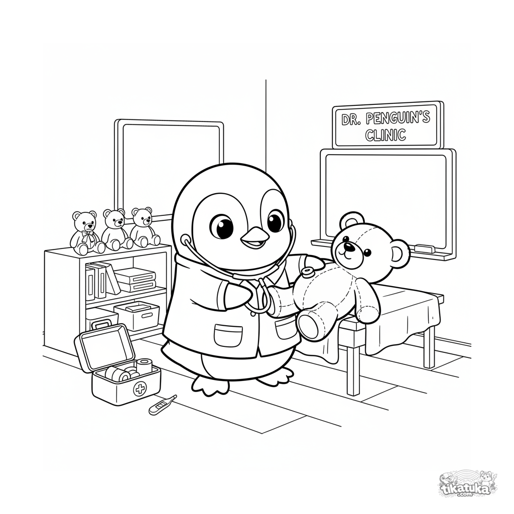 Ausmalbild für Kinder von 4-6 Jahren: ein Pinguin-Tierarzt im weißen Kittel untersucht einen Teddybär in einem Spiel-Klassenzimmer-Krankenhaus.