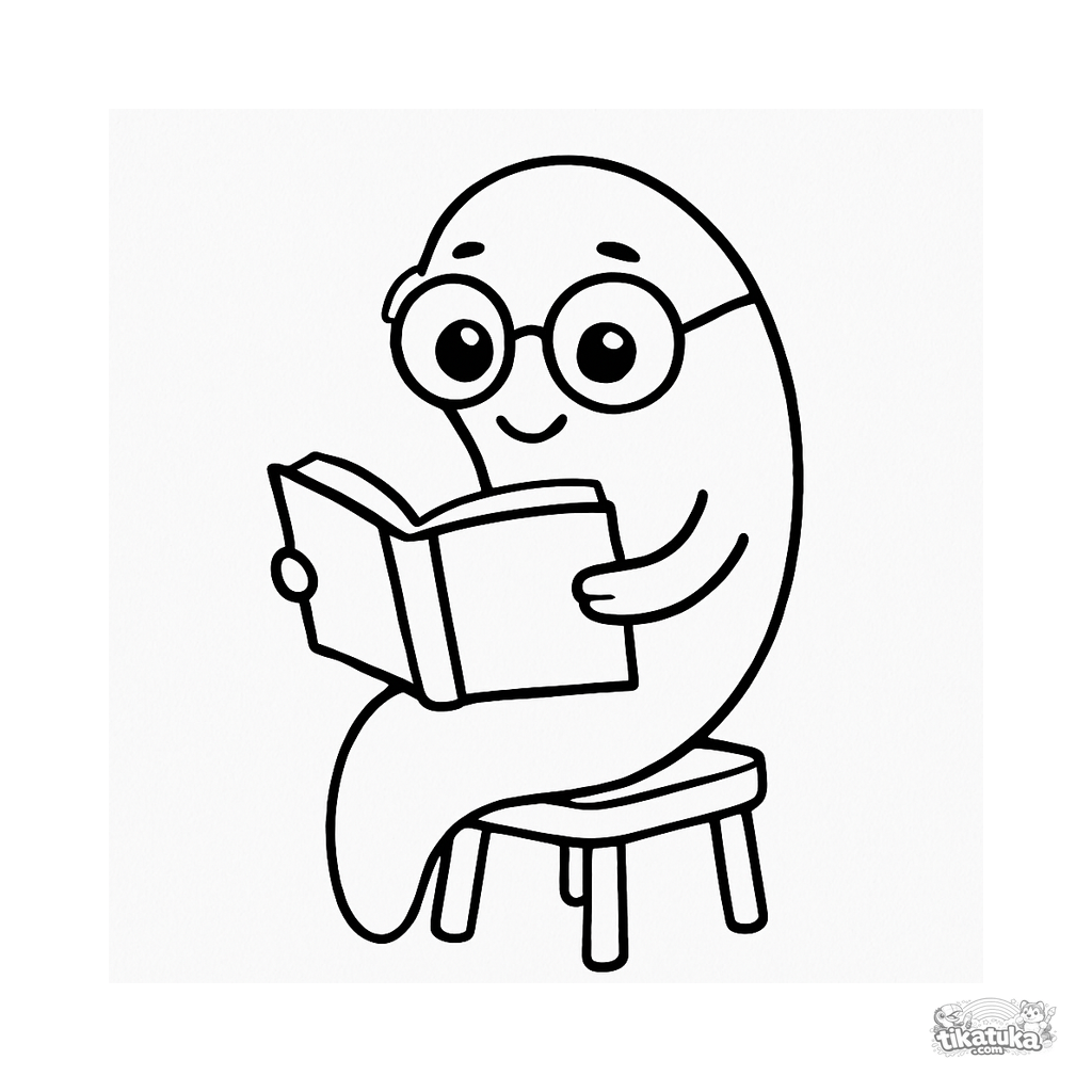 Ausmalbild für Kinder. Niedlicher kommaförmiger Vibrio-Mikrobe sitzt auf Hocker, liest Buch mit Brille. Kostenlos herunterladen.