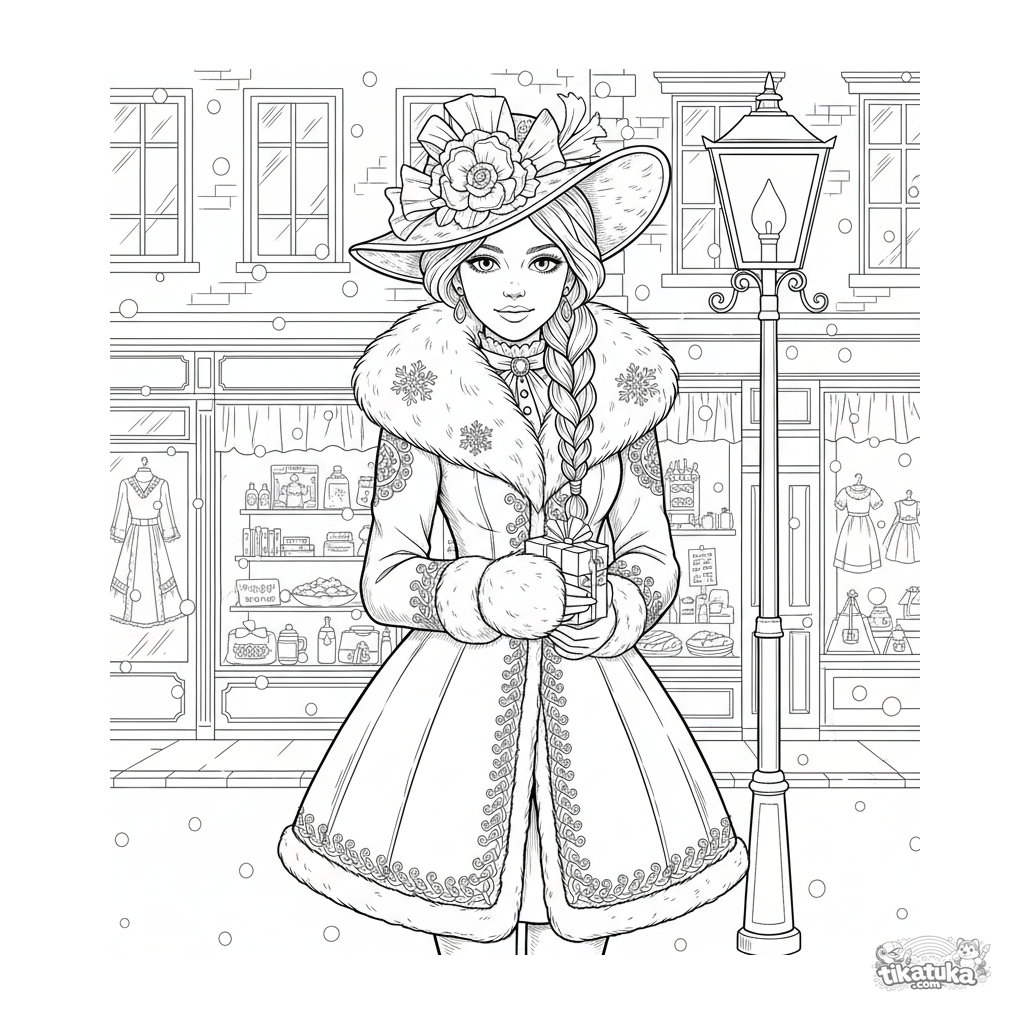 Detailliertes Winter-Ausmalbild für Mädchen 10-12: Ein viktorianischer Wintermantel in einer schneebedeckten Straße. Pelztexturen, Borte, Schneeflocken und Straßenlaterne.