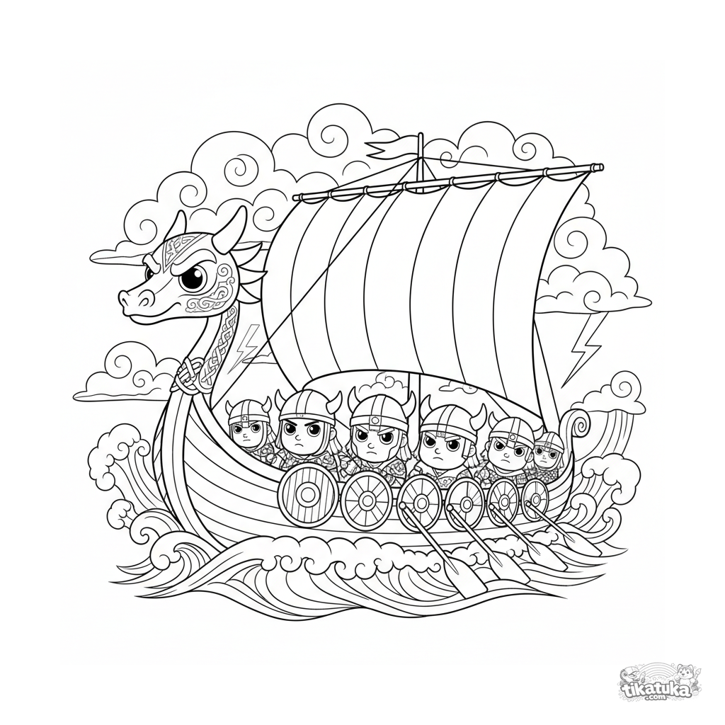 Detailliertes Ausmalbild für 10-12 Jahre: Ein wildes Wikingerschiff mit Drachenbug segelt auf einem stürmischen Meer. Krieger rudern, Schilde an der Seite, Segel voller Wind.