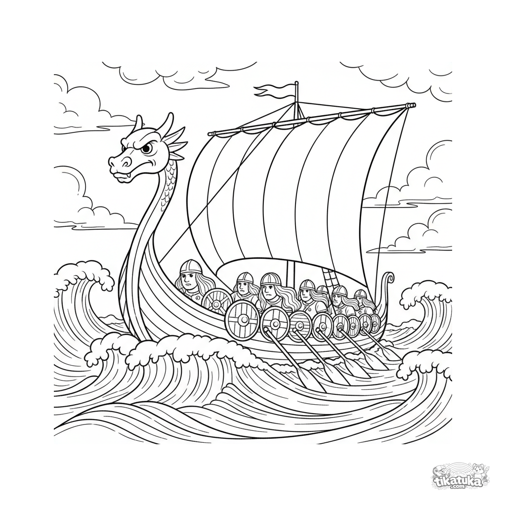Ausmalbild für Kinder 7-9: Ein Wikingerschiff mit Drachenbug fährt auf stürmischer See. Krieger rudern, das Segel bläht sich.