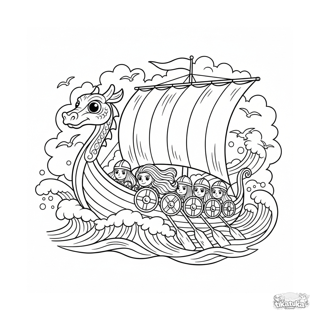 Ausmalbild für Tweens von 7-9 Jahren: ein wildes Wikingerlangschiff kämpft sich durch eine stürmische See. Dynamische Szene im 80er-Jahre-Cartoon-Stil.