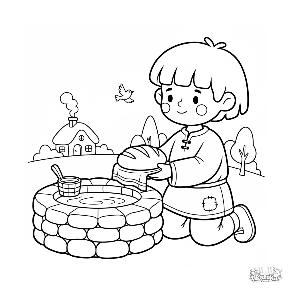 Ausmalbild für Kinder 4-6: Ein Junge dankt, indem er Brot am magischen Brunnen opfert. Klare geometrische Formen, verständliche emotionale Szene.