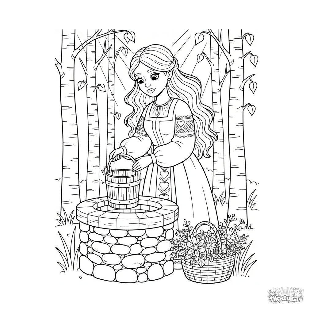 Ausmalbild für Kinder 7-9: Ein Mädchen in Volkstracht schöpft Wasser aus einem magischen Brunnen. Szene im russischen Lubok-Stil.